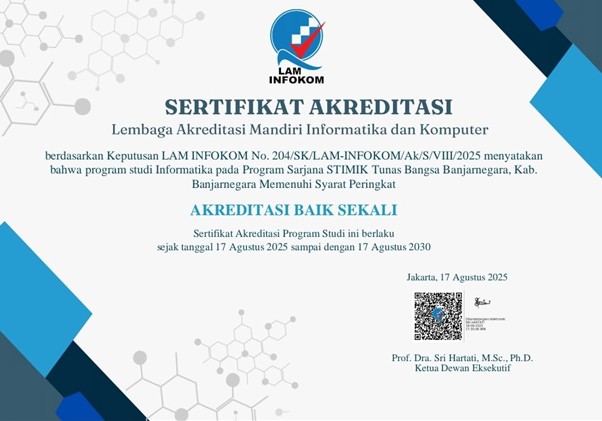 Banjarnegara, 17 Agustus 2025. Tepat di Hari Kemerdekaan Indonesia ke-80, Program Studi Informatika (S1) STIMIK Tunas Bangsa Banjarnegara, resmi naik peringkat akreditasi dari sebelumnya “Baik” menjadi “Baik Sekali” berdasarkan penilaian LAM-INFOKOM, lembaga akreditasi nasional yang berfokus pada bidang informatika dan …