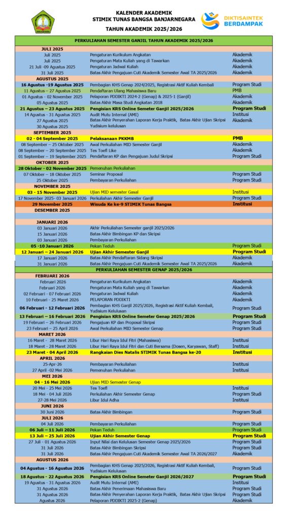 Kalender Akademik STIMIK Tunas Bangsa Tahun Akademik 2025/2026 Informasi ini mencakup jadwal perkuliahan, cuti bersama, masa evaluasi, dan agenda akademik lainnya yang perlu diketahui oleh mahasiswa dan dosen.