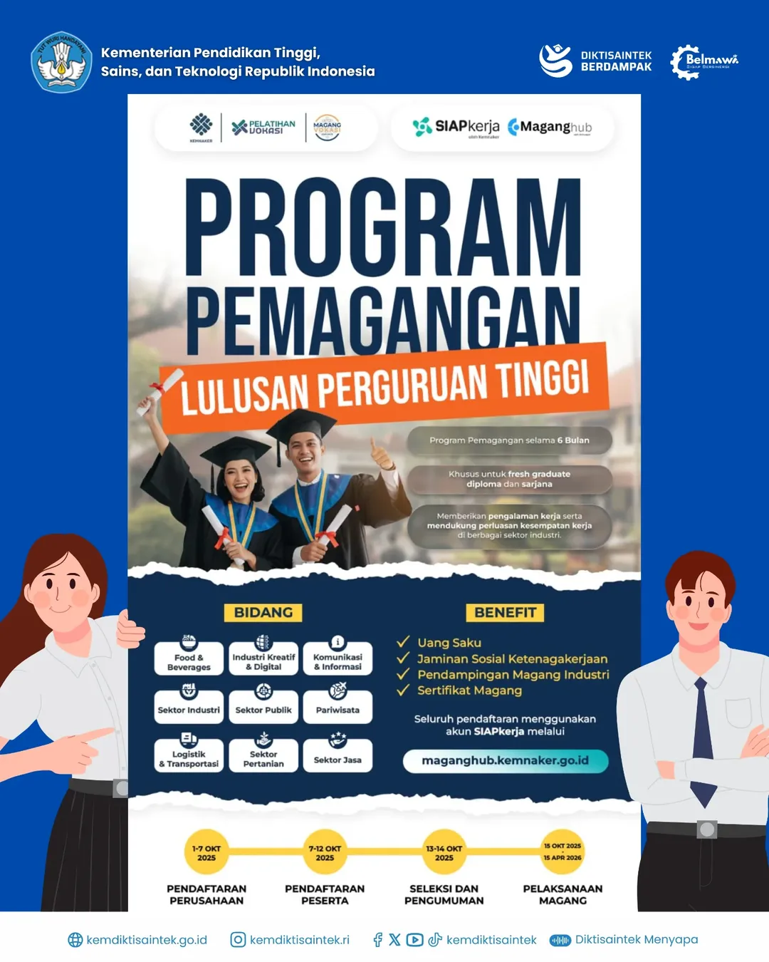 Banjarnegara. Dalam rangka menyiapkan lulusan perguruan tinggi agar siap memasuki dunia kerja, Kementerian Pendidikan Tinggi, Sains, dan Teknologi Republik Indonesia bersama Kementerian Ketenagakerjaan kembali meluncurkan Program Pemagangan Lulusan Perguruan Tinggi tahun 2025. Program ini dirancang untuk memberikan pengalaman kerja nyata bagi fresh graduate tingkat diploma dan sarjana, sekaligus mendukung peningkatan kompetensi dan daya saing tenaga kerja muda.