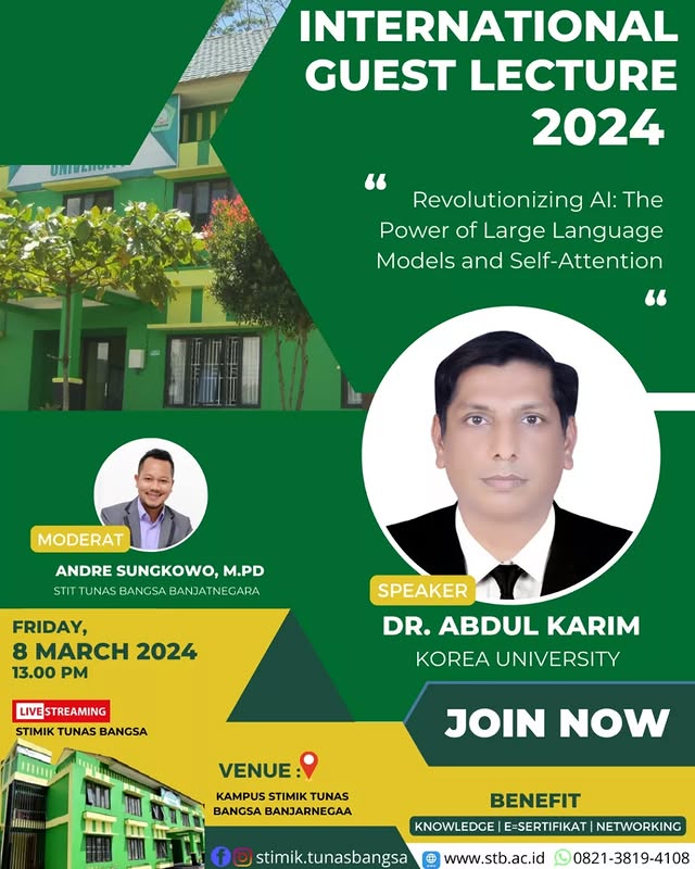 STIMIK Tunas Bangsa Banjarnegara kembali menghadirkan narasumber internasional dalam agenda International Guest Lecture. Kali ini, kuliah tamu menghadirkan Dr. Abdul Karim dari Korea University, yang membawakan materi bertajuk “Revolutionizing AI: The Power of Large Language Models and Self-Attention.”