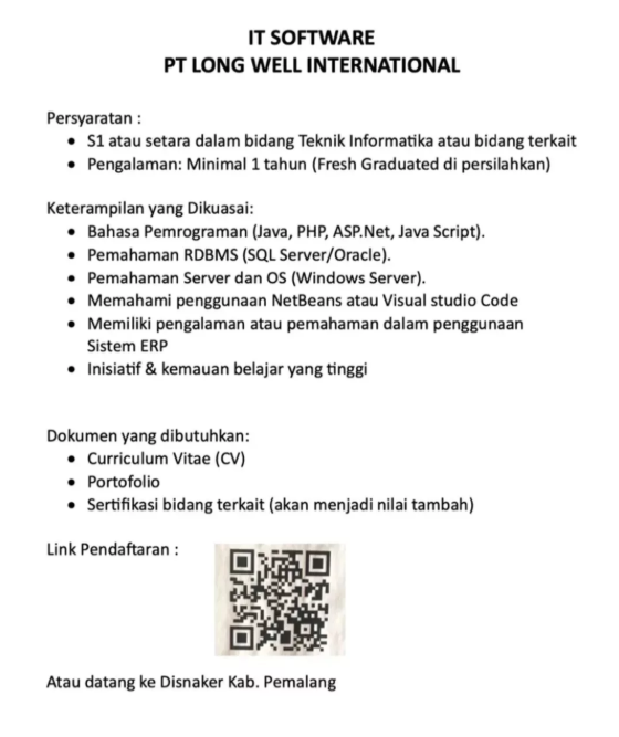 PT Long Well International saat ini membuka kesempatan bagi talenta muda di bidang teknologi informasi untuk bergabung sebagai tenaga IT Software. Lowongan ini ditujukan bagi lulusan S1 atau setara di bidang Teknik Informatika atau bidang terkait, dengan pengalaman minimal satu …